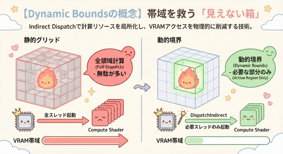 Dynamic Boundsを用いて DispatchIndirect でスレッド発行数を絞ると、計算しなかった領域に対する VRAMへの Read / Write が物理的に発生しません。